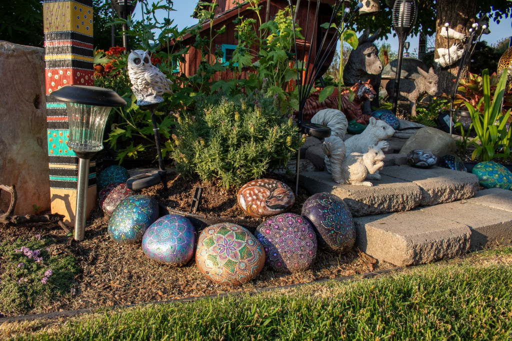 A unique aspect of Norma’s garden is the artistic touch she adds with her hand-painted wooden posts. Adorned with bubbles, sunflowers, mandala art, and intricate patterns, these posts are crafted with acrylic paint and showcase Norma’s self-taught artistic skills. Each post is a piece of art, reflecting her love for creativity and adding a personal touch to her garden.